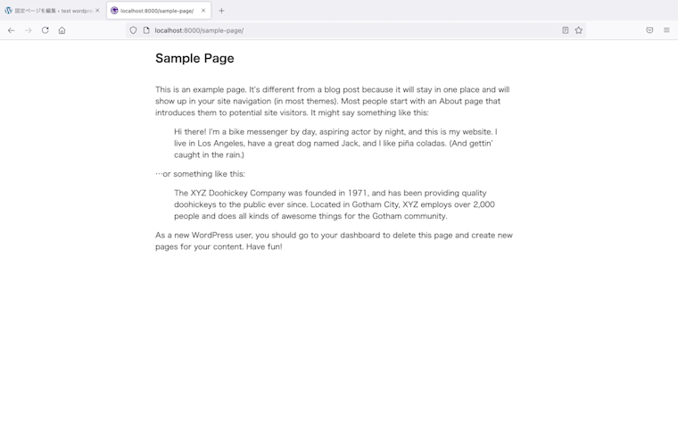 上記の記事に従って進めると、「test wordpress」という名前のWordPressサイトが出来上がっていると思います。 この記事では、その「test wordpress」とGatsbyJSを連携させていきます。